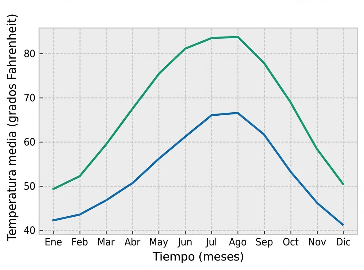 plt.style.use("bmh")fig, ax = plt.subplots() ax.plot(seattle_weather["MONTH"], seattle_weather["MLY-TAVG-NORMAL"]) ax.plot(austin_weather["MONTH"], austin_weather["MLY-TAVG-NORMAL"]) ax.set_xlabel("Time (months)") ax.set_ylabel("Average temperature (Fahrenheit degrees)") plt.show()