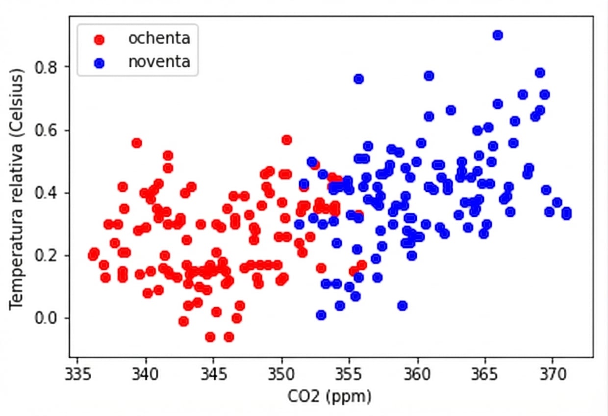 eighties = climate_change["1980-01-01":"1989-12-31"] nineties = climate_change["1990-01-01":"1999-12-31"]fig, ax = plt.subplots()ax.scatter(eighties["co2"], eighties["relative_temp"], color="red", label="eighties")ax.scatter(nineties["co2"], nineties["relative_temp"], color="blue", label="nineties")ax.legend() ax.set_xlabel("CO2 (ppm)") ax.set_ylabel("Relative temperature (Celsius)") plt.show()