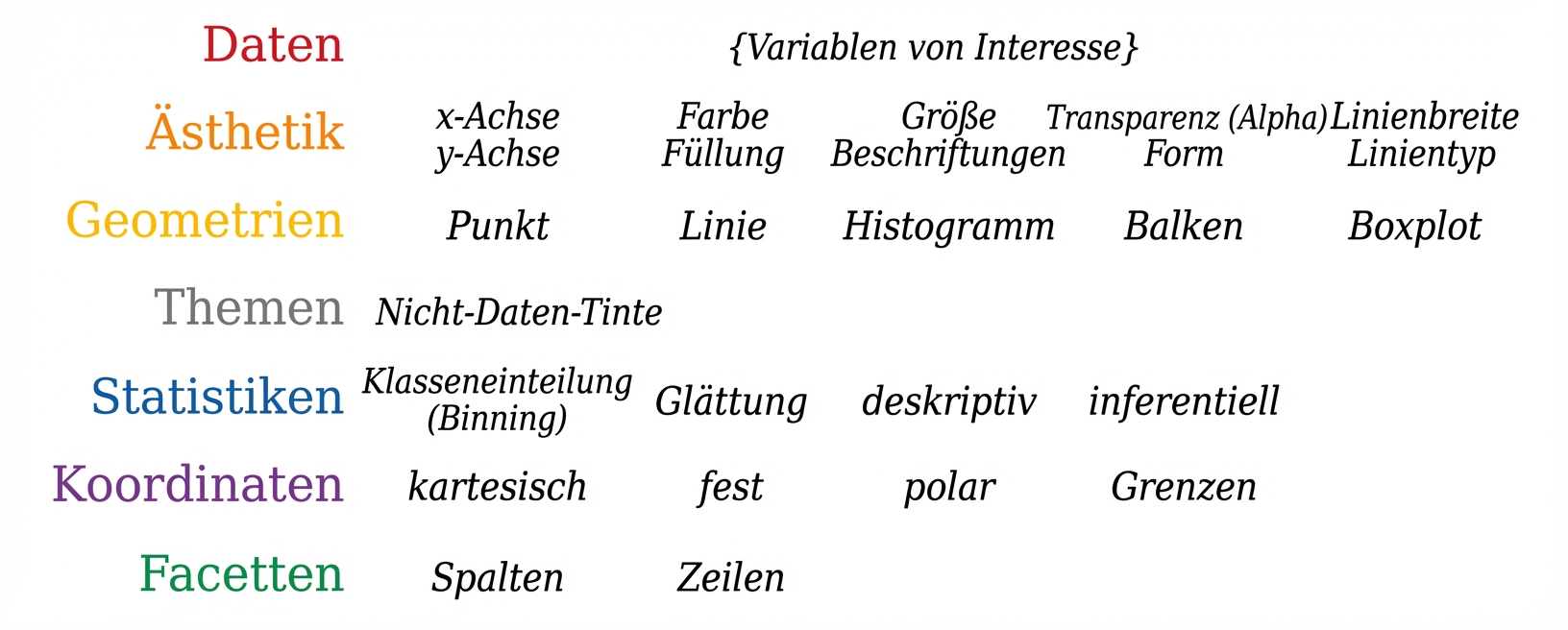 | Ästhetische Elemente | Die Maßstäbe, auf die wir unsere Daten abbilden. |