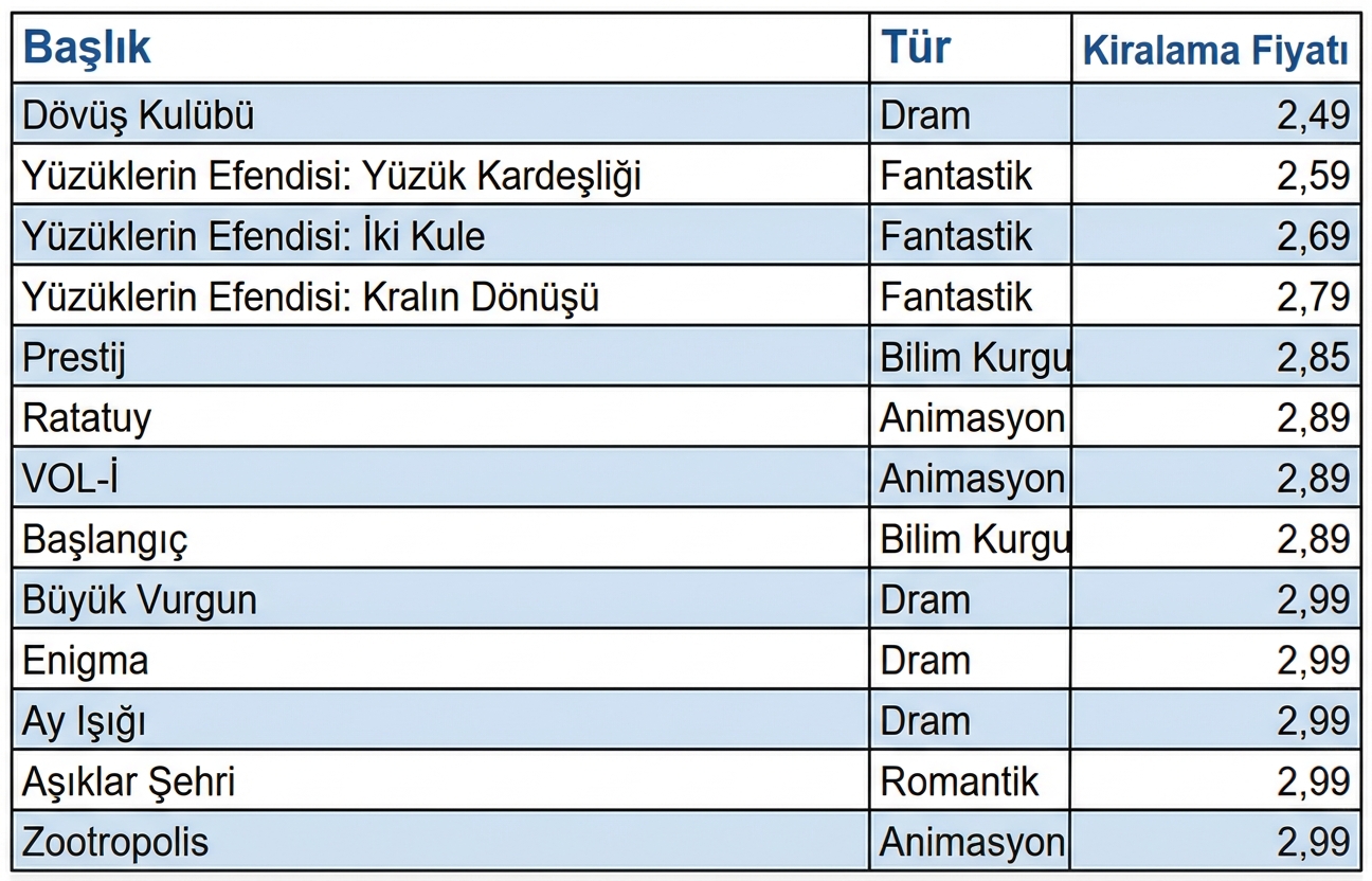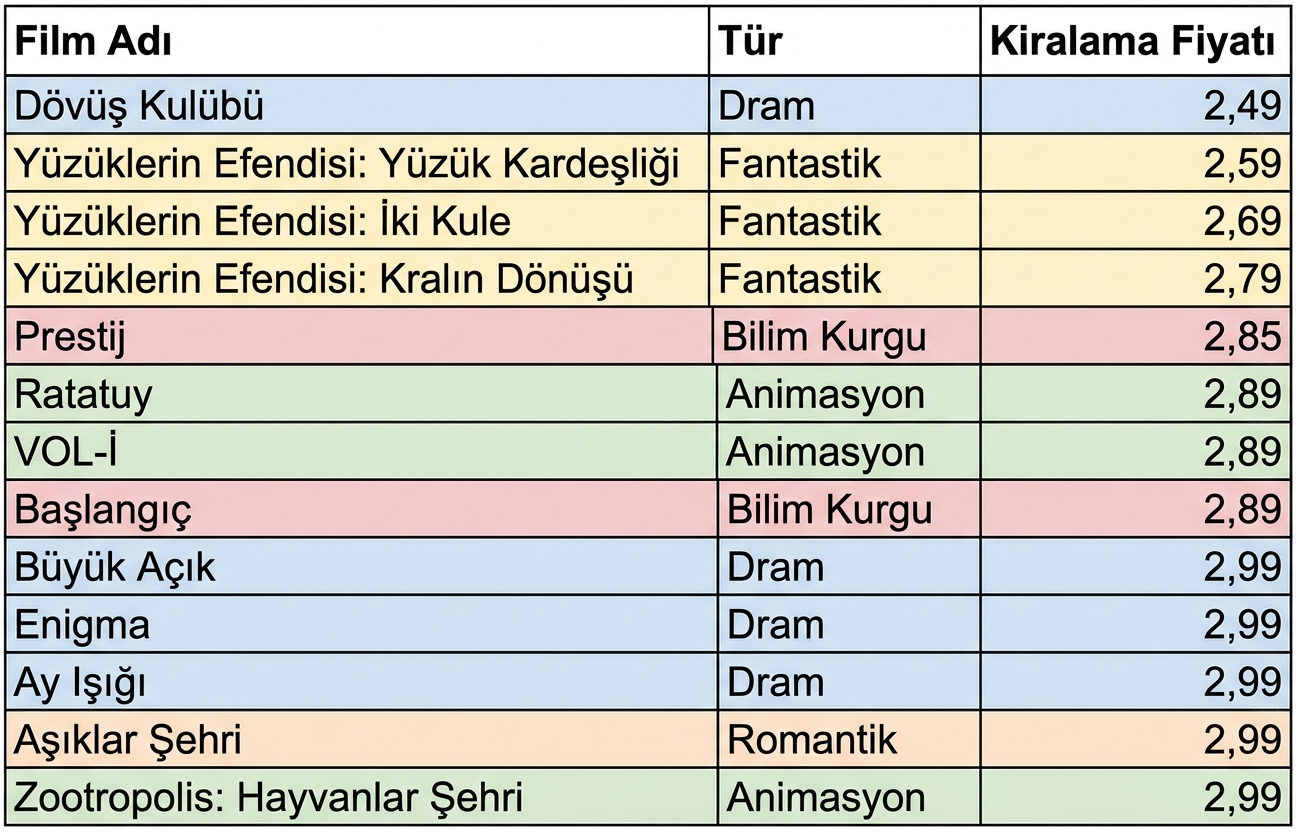 Türe göre filmlerin ortalama fiyatı.