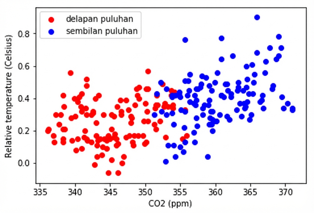 eighties = climate_change["1980-01-01":"1989-12-31"] nineties = climate_change["1990-01-01":"1999-12-31"]fig, ax = plt.subplots()ax.scatter(eighties["co2"], eighties["relative_temp"], color="red", label="eighties")ax.scatter(nineties["co2"], nineties["relative_temp"], color="blue", label="nineties")ax.legend() ax.set_xlabel("CO2 (ppm)") ax.set_ylabel("Suhu relatif (Celsius)") plt.show()