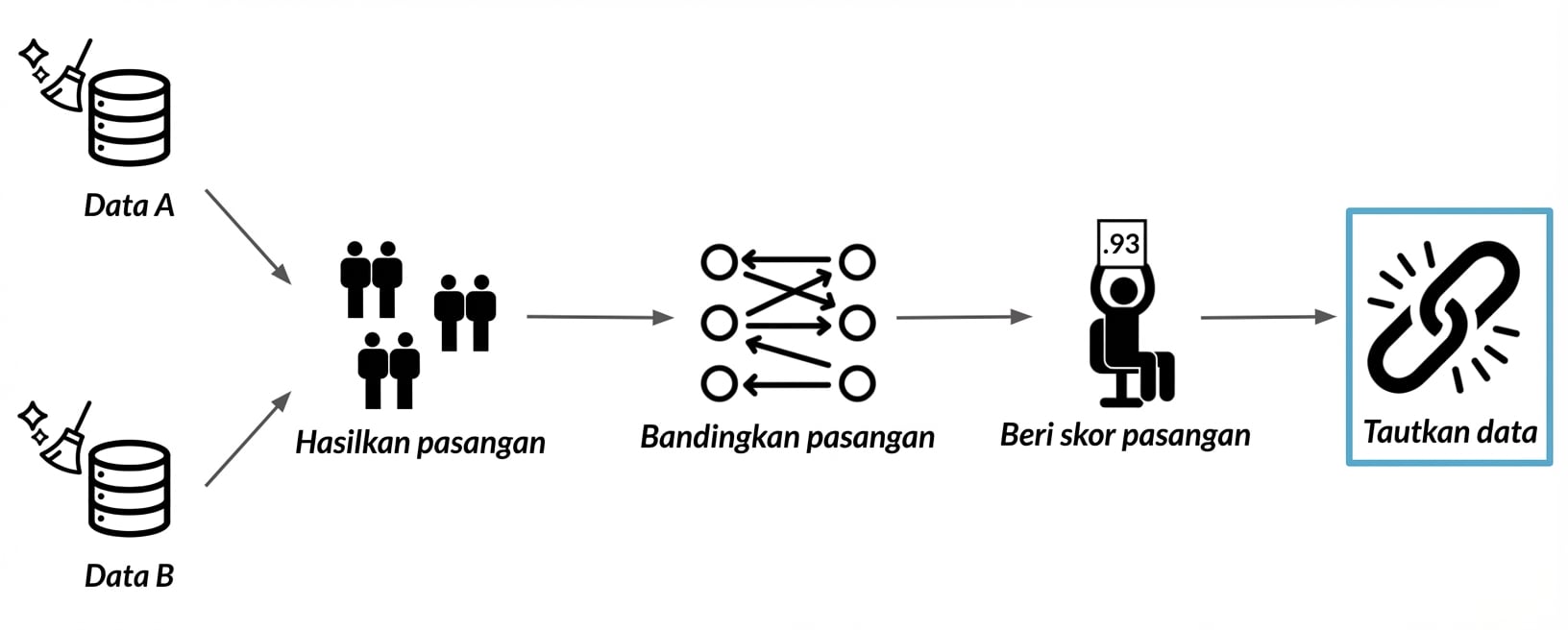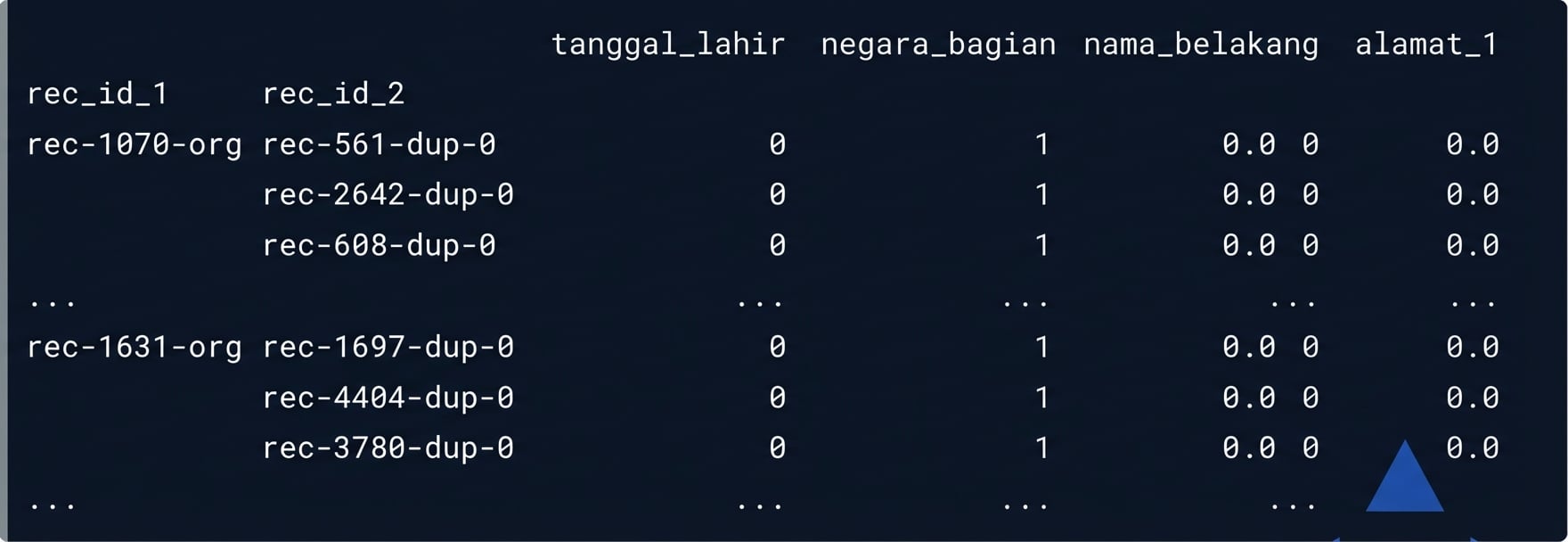# Impor recordlinkage dan buat semua pasangan import recordlinkage indexer = recordlinkage.Index() indexer.block('state') full_pairs = indexer.index(census_A, census_B)# Langkah perbandingan compare_cl = recordlinkage.Compare() compare_cl.exact('date_of_birth', 'date_of_birth', label='date_of_birth') compare_cl.exact('state', 'state', label='state') compare_cl.string('surname', 'surname', threshold=0.85, label='surname') compare_cl.string('address_1', 'address_1', threshold=0.85, label='address_1')potential_matches = compare_cl.compute(full_pairs, census_A, census_B)