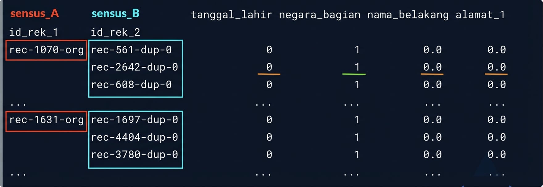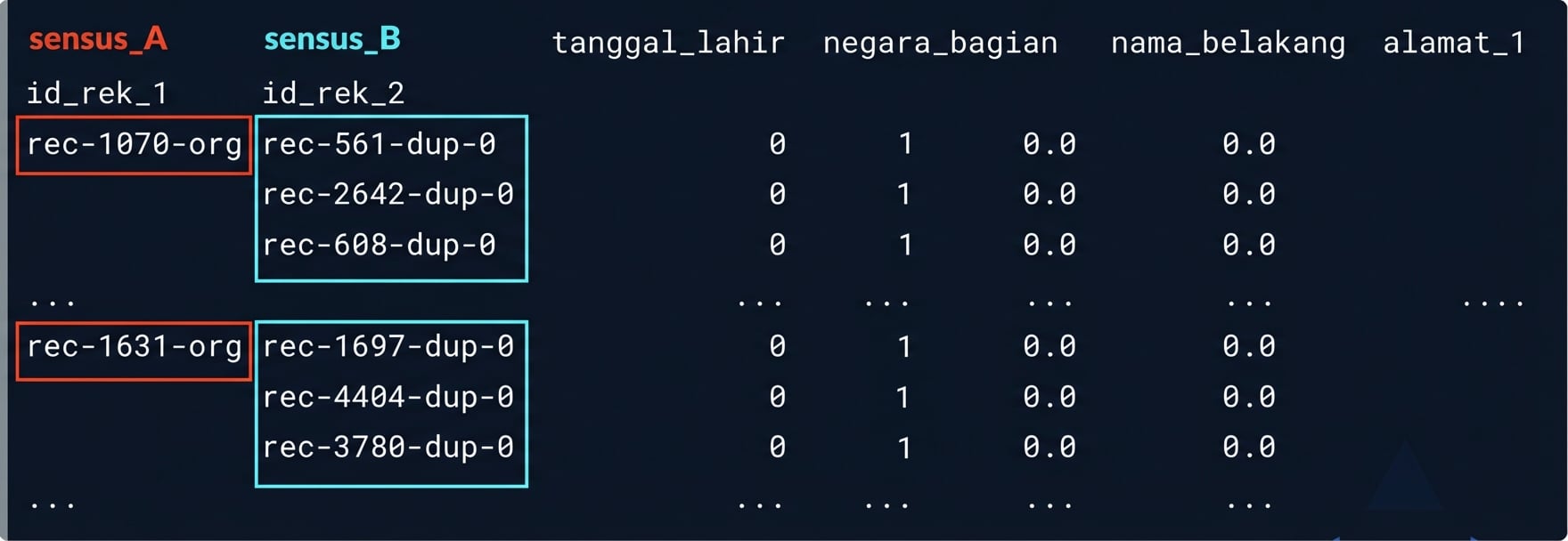 # Menemukan duplikat di census_B census_B_duplicates = census_B[census_B.index.isin(duplicate_rows)]# Menemukan baris baru di census_B census_B_new = census_B[~census_B.index.isin(duplicate_rows)]
