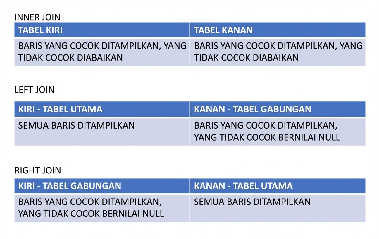 INNER JOIN: Hanya baris yang cocokLEFT JOIN (atau RIGHT JOIN): Semua baris dari tabel utama plus kecocokan dari tabel joinNULL: Ditampilkan jika tidak ada kecocokanLEFT JOIN dan RIGHT JOIN bisa saling menggantikanPengantar SQL Server
